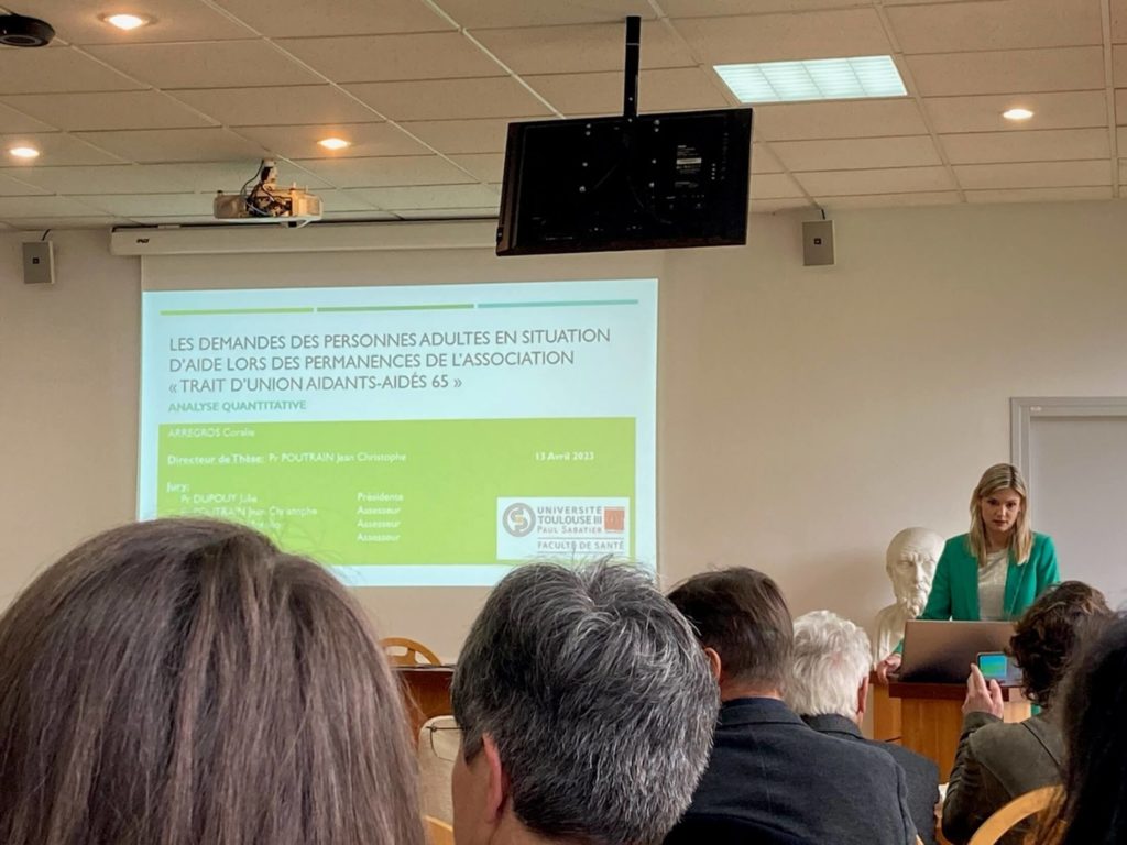 Une année marquée par la soutenance de la thèse par Coralie ARREGROS médecin généraliste sur : « les demandes des personnes adultes en situation d’aide lors des permanences de l’association TRAIT-D’UNION AIDANTS-AIDES 65 » (soutenance du 13 avril 2023. Thèse présentée le 11 juillet salle des conférences au CD 65. Présentation par Coralie ARREGROS lauréate et le Professeur POUTRAIN. »